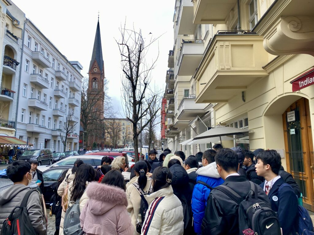 Wir machten einen kiezübergreifenden Spaziergang vom Standort Immanuelkirchstraße in die Prenzlauer Allee. Unser Weg führte uns quer durch die deutsche Musik, Kultur und Geschichte. Von Bach über tomate rockt! vorbei an Stolpersteinen, der Ev. Immanuelkirche und dem Museum Pankow zum Wasserturm mit Städtebau und Hobrecht-Plan. Als wir die Synagoge passierten, konnten wir die derzeitigen Demonstrationen thematisieren und laut über die Friedliche Revolution, Oppositionelle im Prenzlauer Berg und Kunstfreiheit nachdenken. Schön, dass Musik verbindet und Grenzen überwindet! Wie das klang hört ihr hier. Und übernächstes Jahr fahren wir dann hoffentlich mit unseren Ensembles hin.